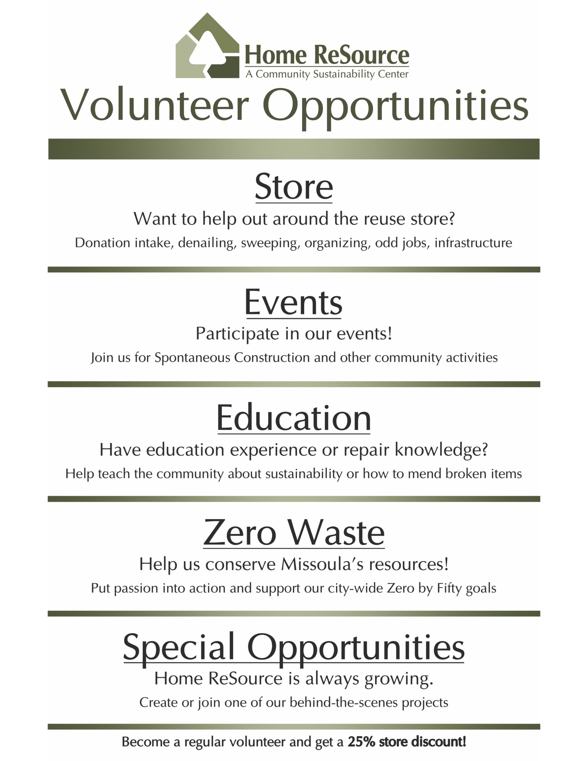 My primary role at Home ReSource has been streamlining and updating their volunteer program. Click here to visit the volunteer page I made on their website and see the plans and digital content I created below.